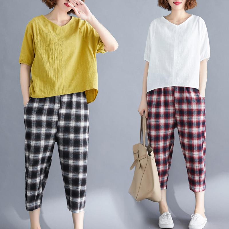 - ลำลองผ้าฝ้ายผ้าฝ้ายและผ้าลินินชุดหญิงฤดูร้อนวรรณกรรมแนวย้อนยุคหลวมเสื้อยืดตารางสามส่วนกางเกงฮาเร็มผ้าลินินขนาดใหญ่ชุดสองตัว ขายในราคาถูก